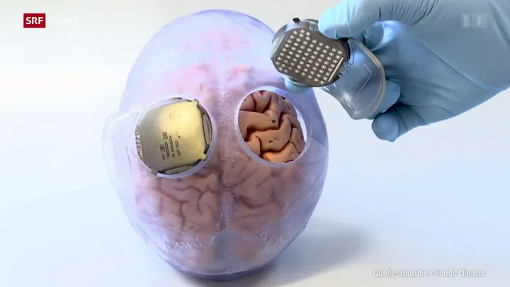 Friedhelm Hummel: Solche «Chips» werden in der Regel auf oder in die Hirnrinde implantiert. Man muss sich das wie eine wenige Zentimeter grosse Platte aus einem körperkompatiblen Material vorstellen, in welche eine Vielzahl von sehr kleinen Elektroden integriert sind, die die Hirnaktivität messen können. Natürlich muss dieser Chip mit einer Energieeinheit und einer Datentransfereinheit verbunden sein. Diese Chips werden über eine kleine Öffnung der Schädeldecke eingebracht. Klassische Implantate für die Stimulation sind die sogenannte Tiefenhirnstimulation (DBS), die regelmässig zur Behandlung der Parkinsonkrankheit eingesetzt wird. Hier wird eine dünne Elektrode in tiefgelegene Kerngebiete des Gehirns (z. Bsp. GPi, STN) eingebracht und über wenige Elektroden diese Hirngebiete stimuliert.