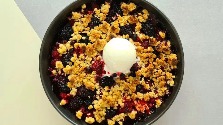Beeren in einer Gratinform verteilen. Streusel darüberstreuen.