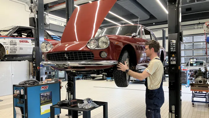 In der Autowerkstatt arbeitet Werkstattchef Adrian Schwarzer gerade an einem Ferrari. «Der Unterschied zur «normalen» Autogarage ist, dass sie hier alle Auto-Marken reparieren. Das macht die Arbeit abwechslungsreich.»