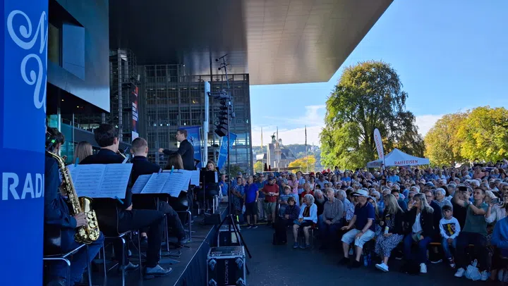 Vor dem KKL Luzern bot die gemeinsame Livesendung der SRF Musikwelle und dem World Band Festival beste musikalische Unterhaltung. Bei strahlendem Wetter versammelte sich ein Rekordpublikum auf dem Europaplatz, um fünf Formationen live zu erleben: