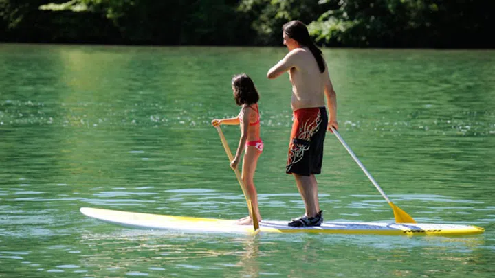 Sie fallen von weitem auf: «Stand-up-Paddler» stehen kerzengerade auf ihrem Surfbrett, in der Hand ein Paddel. Der Sport ist ein Trend auf Schweizer sehen und weniger schwierig als Windsurfen.