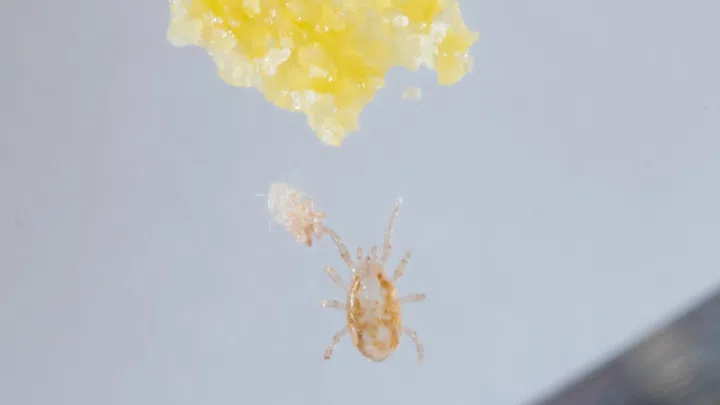 Hier helfen besondere Nützlinge: die Raubmilben. Es gibt zwei verschiedene Arten: Die eine frisst Spinnmilben, die andere Thripse. Raubmilben suchen auf der Pflanze aktiv nach ihrer Beute und saugen diese aus.
