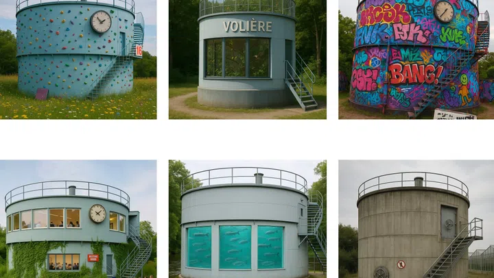 Der Kanton Baselland verschenkt einen Gasspeicher. Den Transport des tonnenschweren Ungetüms müssen allerdings die neuen Besitzer übernehmen. Um sie dennoch anzulocken, haben Mitarbeiter Vorschläge entwickelt, was man aus dem Gasspeicher machen könnte: Boulderhalle, Fischzucht, Café, Gewächshaus.