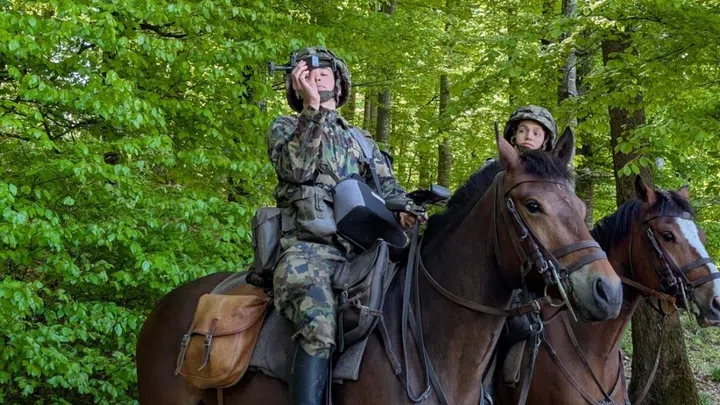 Auf dem Waffenplatz Sand in Schönbühl bei Bern wird eine kleine Gruppe von Rekrutinnen und Rekruten zu Drohnenpiloten ausgebildet, und zwar hoch zu Ross. Diese Form der Überwachung eigne sich vor allem bei kritischen Infrastrukturen mit grossem Perimeter, so die Armee.