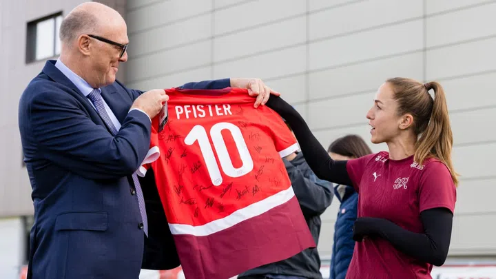 Der Zuger Bundesrat Martin Pfister besucht die Spielerinnen der Nationalmannschaft in ihrem Trainingslager in Weggis LU. Am Freitag spielt die Nati in Luzern gegen Kanada.