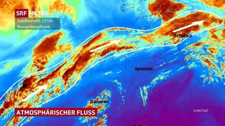 Die Situation vor ein paar Tagen mit dem vielen Regen und den Überschwemmungen war so eine. Verantwortlich für die grossen Regenmengen war nämlich ein sogenannter «atmosphärischen Fluss», der viel Feuchtigkeit aus den Subtropen in Form von Wasserdampf über den Atlantik bis zu uns brachte.