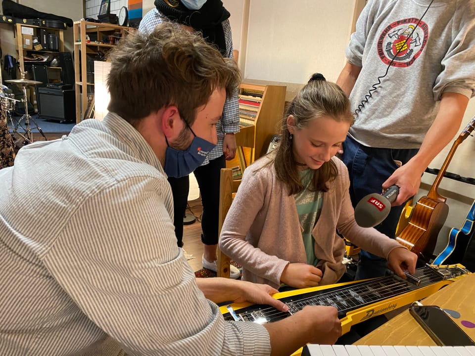 Bild 8 von 8. Weiter darf Paula noch ein ganz spezielles Instrument ausprobieren: Eine «Lap-Steel-Gitarre»! Dieses Instrument hat Produzent Martin übrigens auch im Song «Tides Of Life» verwendet. Bildquelle: SRF.