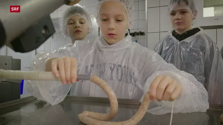 Bild 2 von 4. Wir dürfen das Wursten auch selber ausprobieren. Bildquelle: SRF Kids.