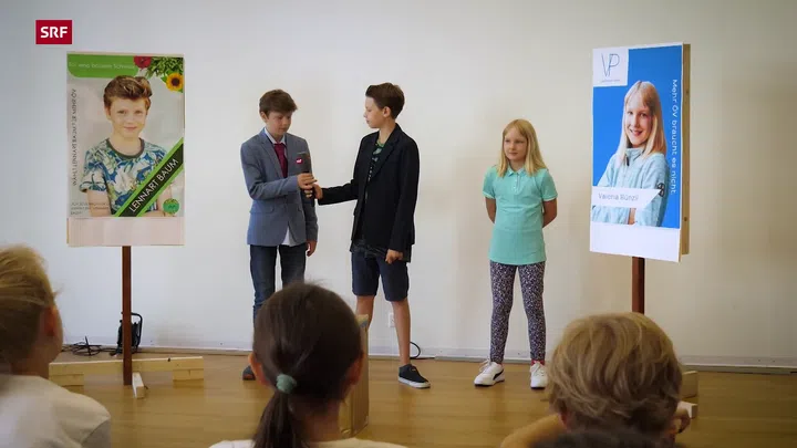 Bild 5 von 5. Wahlresultat. Lars verkündet das Wahlresultat, das du in den «SRF Kids News» erfährst. Bildquelle: 5./6. Klasse Kemmatten.