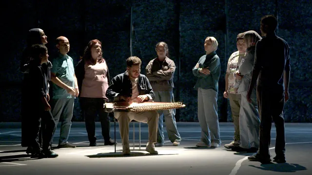 Statt Bilder von Krieg und Elend zu zeigen, versammelt Wadimoff seine Protagonistinnen und Protagonisten in einem neutralen, schwarzen Raum. Auf den Boden wird mit weissen Linien eine sehr vereinfachte Karte von Gaza gezeichnet. Vierecke zeigen an, wer wo gelebt hat.