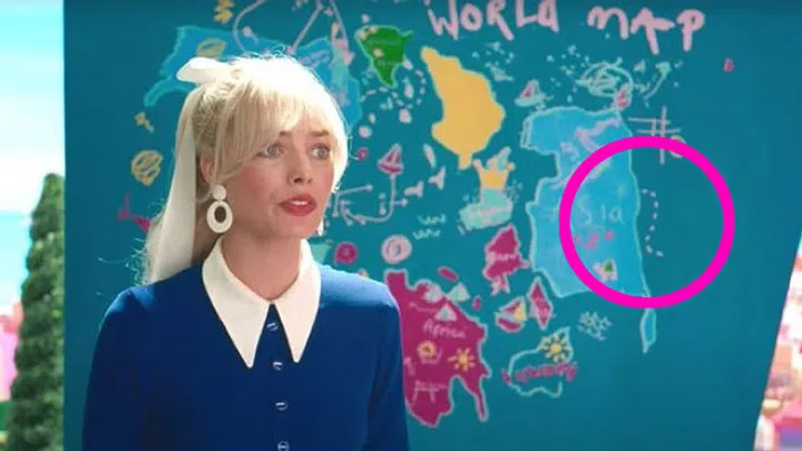 Barbies Weltkarte ist in einer Szene zu sehen, als Barbie (Margot Robbie) einen Abstecher in die «echte Welt» machen soll. Die Karte eben dieser «echten Welt» ähnelt einer Kinderzeichnung: Die hingekritzelten Kreise sind angeschrieben mit Afrika, Australien und Asien – und genau bei diesem Kontinent ragt die gestrichelte Linie ins Meer.