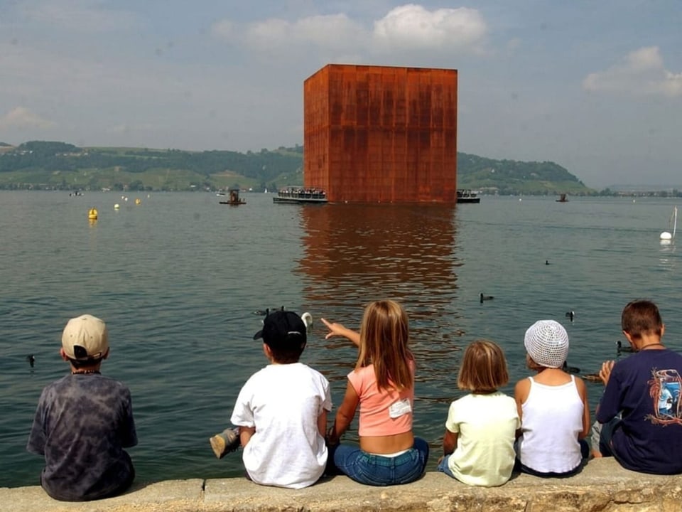 Bild 3 von 7. Ein Highlight der Expo.02: der schwimmende, rostige Monolith in Murten. Bildquelle: KEYSTONE/Sigi Tischler.