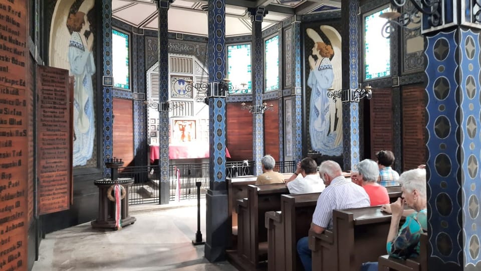 Als wir die lange, gemauerte Treppe erklommen haben und Cuder die quietschende Tür öffnet, bin ich überwältigt. Die Kapelle ist ein Kleinod des Jugendstils. Der ganze Innenraum ist mit Ornamenten ausgemalt, zwei riesige Engel rahmen den Altar ein.