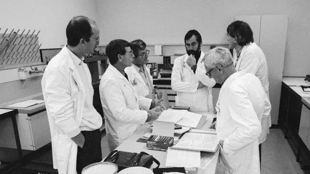 Bild 3 von 6. Mai 1986: Durch den Genuss von Frischmilch sei in den vergangenen Monaten zu viel radioaktives Jod in die Schilddrüsen von Schweizer Kindern gelangt. Am Eidgenössischen Institut für Reaktorforschung kann mit diesem Gerät der Gehalt an radioaktiven Nukliden in der menschlichen Schilddrüse gemessen werden. Bildquelle: KEYSTONE/Str.