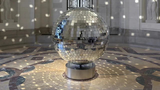 Eine übergrosse Discokugel empfängt die Besuchenden im Museumsfoyer. Gemächlich rotiert sie in Ankleidespiegelhöhe. Die kleinen Spiegel an der Oberfläche reflektieren den Raum, die Kommenden und Gehenden. Zerteilt in kleine Facetten, streut die Kugel die eingefangenen Bilder wieder aus, projiziert sie auf die Wände, und schickt sie zurück zu den Betrachtenden.