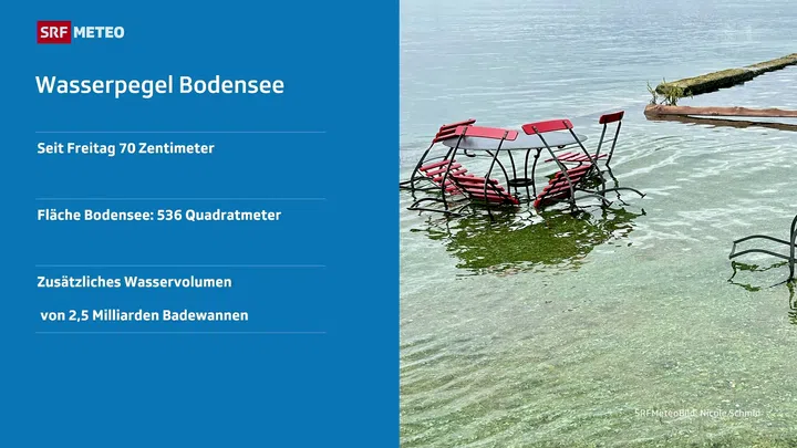 Gemäss dem Bundesamt für Umwelt besteht am Bodensee grosse Hochwassergefahr, Stufe 4 von 5. Für den Hochrhein gilt noch bis Dienstag erhebliche Gefahr, Warnstufe 3. Für den restlichen Rhein, den Vierwaldstättersee, Teile der Reuss und den Zürichsee gilt derzeit noch die Gefahrenstufe 2.