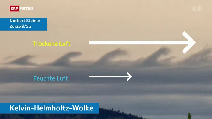 Unten ist die Luft feucht und der Wind bläst schwach. Darüber ist die Luft warm und der Wind weht deutlich stärker. Durch den unterschiedlich starken Wind bewegt sich die Wolkenschicht oben stärker als unten. Dadurch verzieht sie sich und es entsteht eine Welle. Dies funktioniert auch, wenn der Wind unten und oben in unterschiedliche Richtungen weht.