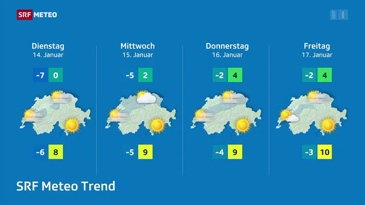 Wer am Sonntag auf die Skipisten geht, sollte sich warm anziehen: Auf 2000 Metern ist es eisig kalt mit maximal -7 Grad. Danach geht es täglich aufwärts. Ab Donnerstag wird es richtig mild mit einer 2000 Meter-Temperatur von +6 Grad.