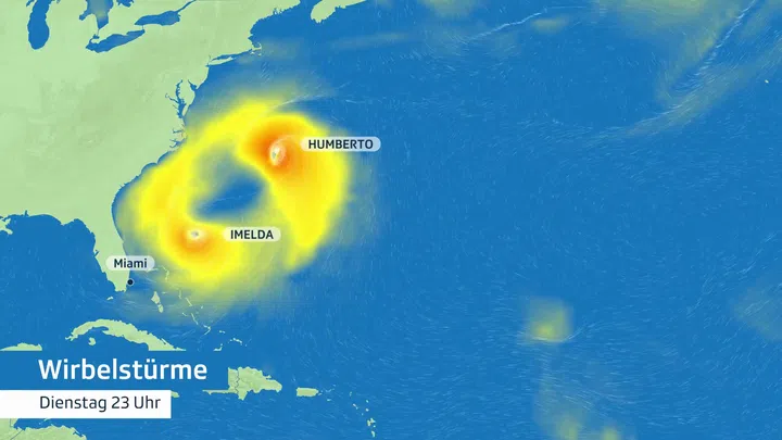 Im Atlantik wütet Hurrikan Humberto. Vor der Küste Floridas befindet sich der tropische Sturm Imelda auf seinem Weg zu einem Hurrikan.