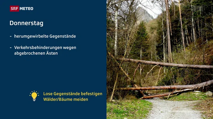 - Am Donnerstag im Flachland Sturmböen von 60 bis 100 km/h, auf den Bergen Orkanböen bis lokal 150 km/h.