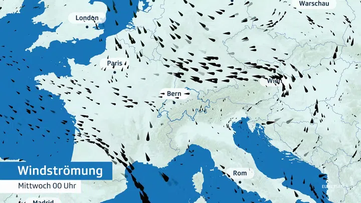 Im Flachland ist es mindestens zeitweise sonnig und es regnet nur selten. Dabei ist es im westlichen Mittelland sonniger als im Osten. Am ehesten wird es in der Nacht auf Mittwoch stellenweise nass. Der Wind weht am Dienstag schwach bis mässig aus westlichen Richtungen, am Jurasüdfuss kommt teils zügiger Joran auf. Am Mittwoch weht schwache, am Genfersee mässige Bise.