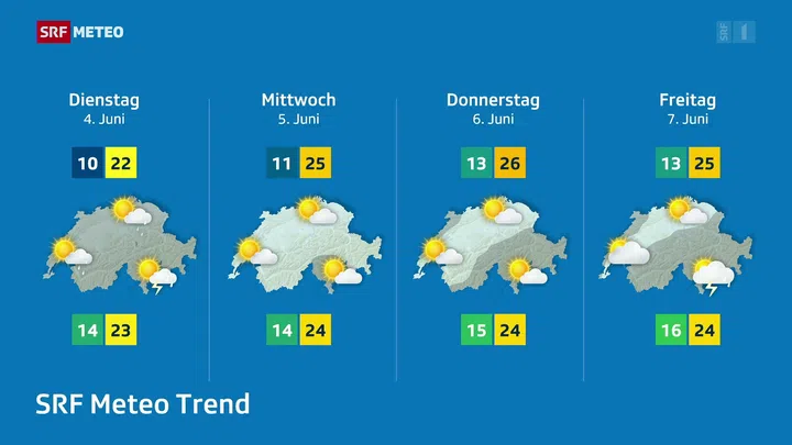 - ... die Sommerwärme: Am Samstag wird es im Tessin über 20 Grad warm, am Montag dann auch im Mittelland. Ab Mittwoch reicht es voraussichtlich gleich an mehreren Orten für einen Sommertag, mit Höchstwerten über 25 Grad.