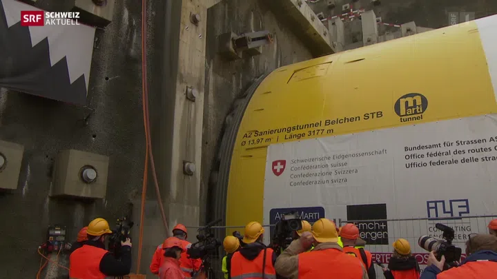 Mit einem Schilddurchmesser von fast 14 Metern, einer Länge von 75 Metern und einem Gewicht von 2000 Tonnen ist die am Belchen zum Einsatz kommende Tunnelbohrmaschine die derzeit grösste in der Schweiz. Sie soll voraussichtlich in drei Jahren auf der Nordseite in Baselbieter Eptingen wieder ans Tageslicht kommen.