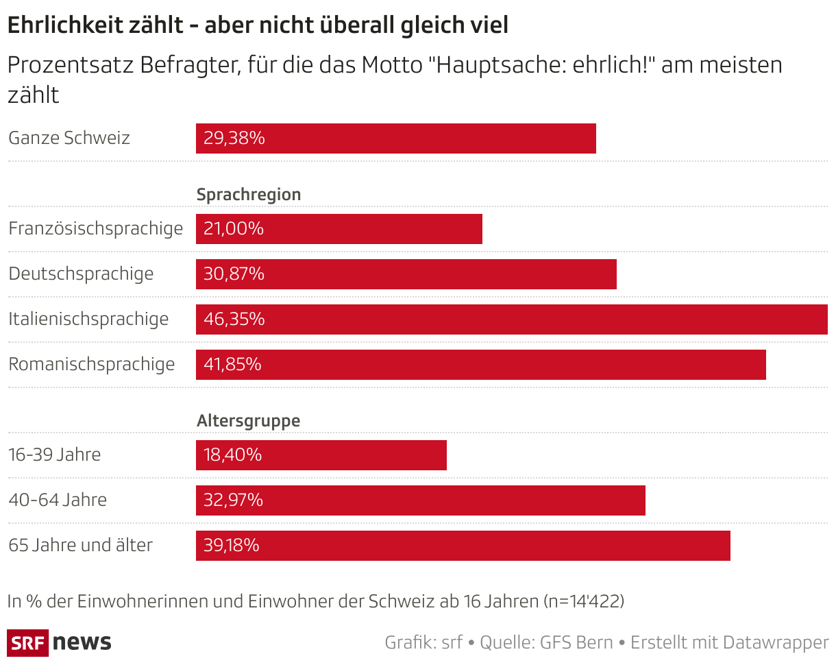 Für die Über-40-Jährigen und für die nicht französischen Landesteile steht hingegen ein anderes Lebensmotto zuoberst: «Hauptsache: ehrlich!» Am deutlichsten ist die Zustimmung dazu bei den Über-65-Jährigen und im Tessin. Die Jüngeren nehmen es dagegen mit der Ehrlichkeit weniger genau. Die Aussage «Ich lüge andere Menschen öfters an, als ich eigentlich will» trifft für 18 Prozent der 16- bis 39-Jährigen vollständig oder eher zu, bei den Über-65-Jährigen nur für 4 Prozent.