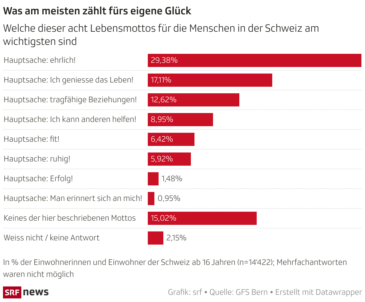 Weit vorne auf Platz zwei liegt dafür ein Lebensmotto, das gar nicht zum Klischee-Bild der Schweizerinnen und Schweizer passt und gewissermassen die Antithese ist zur Leistungsgesellschaft: «Hauptsache: Ich geniesse das Leben!»