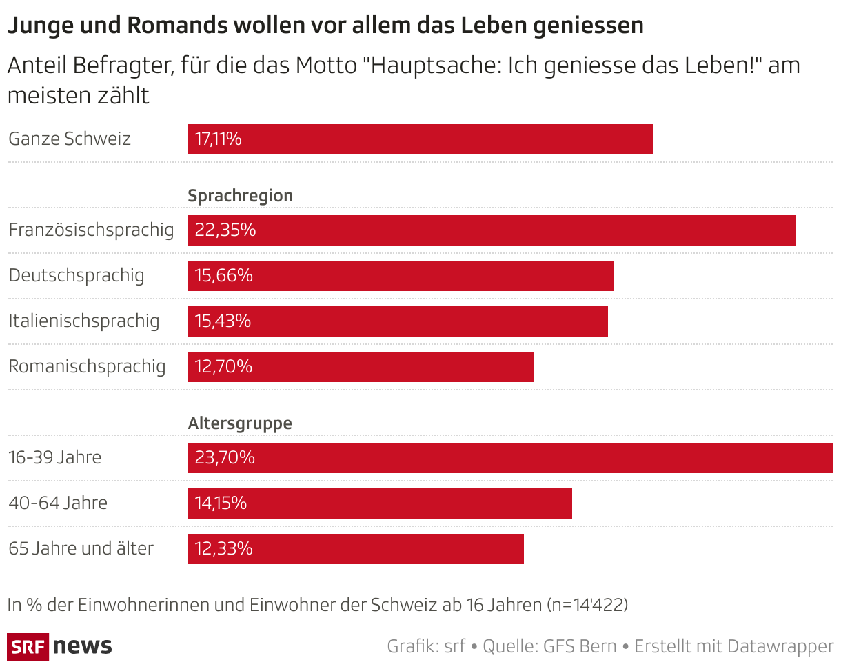 In der Tat steht für die Jüngeren, also die 16- bis 39-Jährigen, das Lebensmotto «Hauptsache: Ich geniesse das Leben!» klar an erster Stelle – im Unterschied zu den anderen Altersgruppen. Unter den Sprachregionen ist die Romandie die einzige, die ebenfalls dieses Motto am höchsten gewichtet.