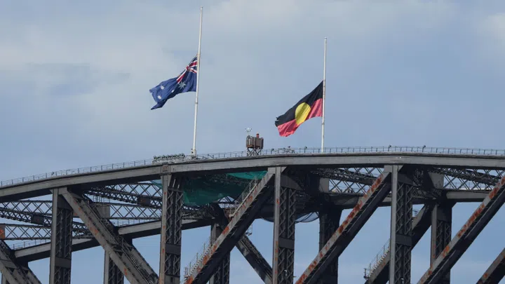 Bild 3 von 7. Die australische Flagge und die Flagge der Aborigines steht während des nationalen Gedenktags auf halbmast. (21. Dezember). Bildquelle: Keystone/Mark Baker.