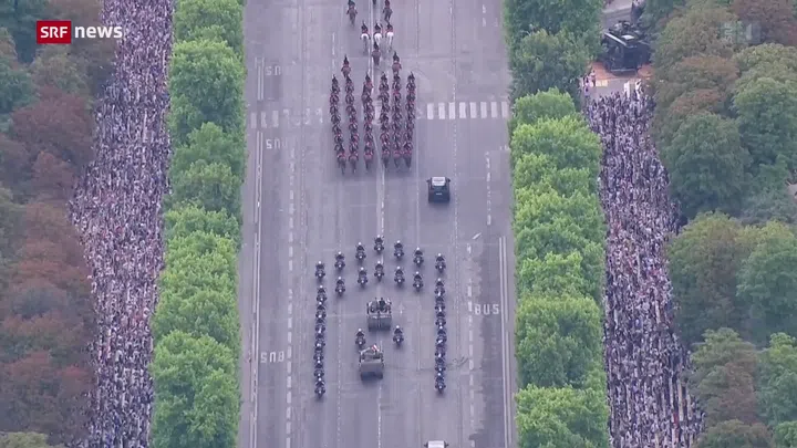 Die Patrouille de France fliegt über den Triumpfbogen hinweg, den Champs-Elysées entlang und färbt den Himmel über Paris blau, weiss und rot ein. Danach folgen Kampfflugzeuge, Drohnen, diverse Militärfahrzeuge, Helikopter und Soldaten. Frankreich feiert seinen Nationalfeiertag.