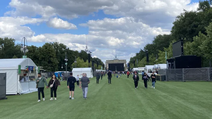 Direkt am deutschen Tor der Superlative, dem niemals ein 11-Meter ins Netz gehen wird, dem Brandenburger Tor, liegt die Fanmeile – mit dem riesigen Bildschirm und dem künstlichen Rasen.