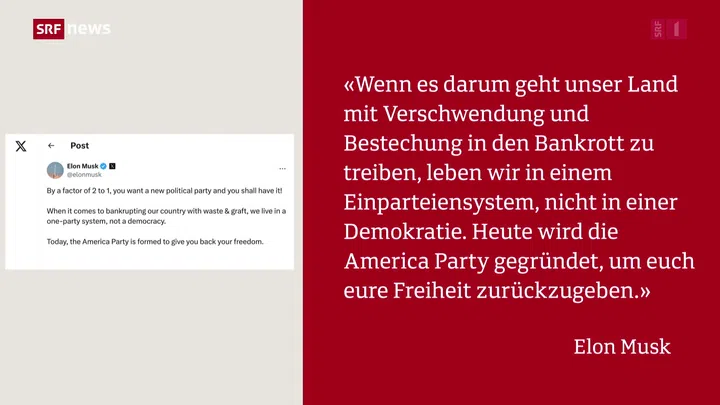 «Im Verhältnis 2:1 wollen Sie eine neue politische Partei und Sie werden sie bekommen!», schrieb er zu den Resultaten. Wenn das Land durch Verschwendung und Korruption in den Bankrott getrieben werde, lebe man in einem Einparteiensystem und nicht in einer Demokratie, begründete Musk seinen Schritt. Darum sei heute die America Party gegründet worden.