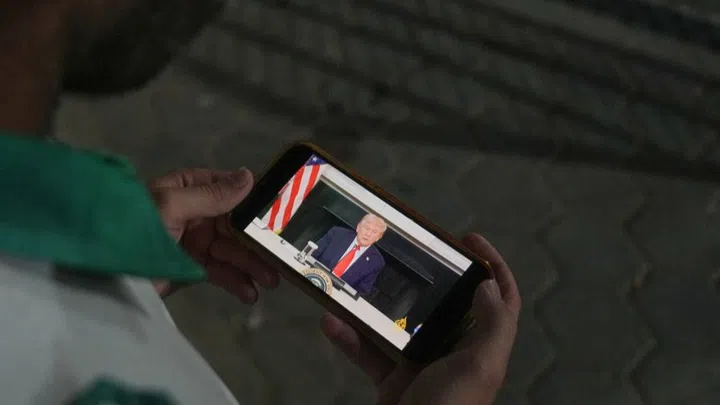 Bild 5 von 6. Ein palästinensischer Sanitäter verfolgt die Ansprache von US-Präsident Donald Trump vor dem Al-Aqsa-Spital in Deir al-Balah. Bildquelle: Keystone/AP Photo/Abdel Kareem Hana.