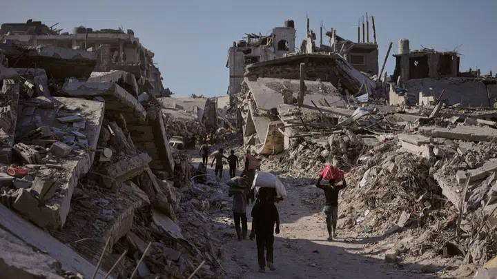 Bild 4 von 4. Eine Kreuzung in Gaza-Stadt, deren Umgebung durch Bombardierungen zerstört wurde. (15.10.2025). Bildquelle: Keystone/AP Photo.