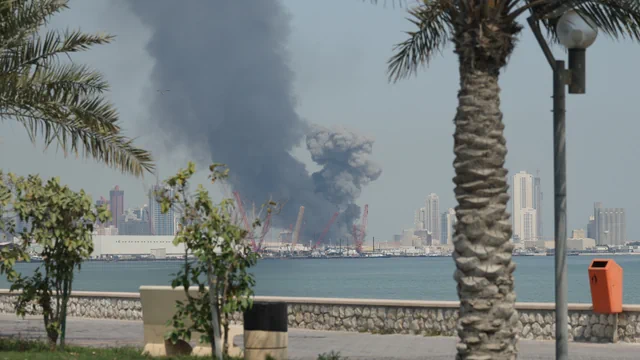 Bild 4 von 5. Die Golfstaaten stecken in einem Dilemma: Als Gastgeber Zehntausender US-Truppen sind sie auch durch ihre geografische Nähe zum Iran ein leichtes Ziel für Teherans Angriffe. Greifen sie den Iran ihrerseits an, werden sie zu aktiven Parteien eines Krieges. Bild: iranische Attacke auf US-Marinestützpunkt in Manama (Bahrain). Bildquelle: Getty Images/Anadolu/Stringer.