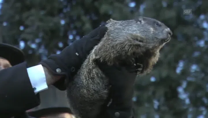 Dreimal klopft ein Mann mit Zylinder an die Tür des künstlichen Murmeltierbaus, um «Punxsutawney Phil» aufzuwecken. Dann greift er das Tier am Pelz und zerrt es aus seinem Winterquartier. Es hat nunmal eine wichtige Aufgabe zu erfüllen.