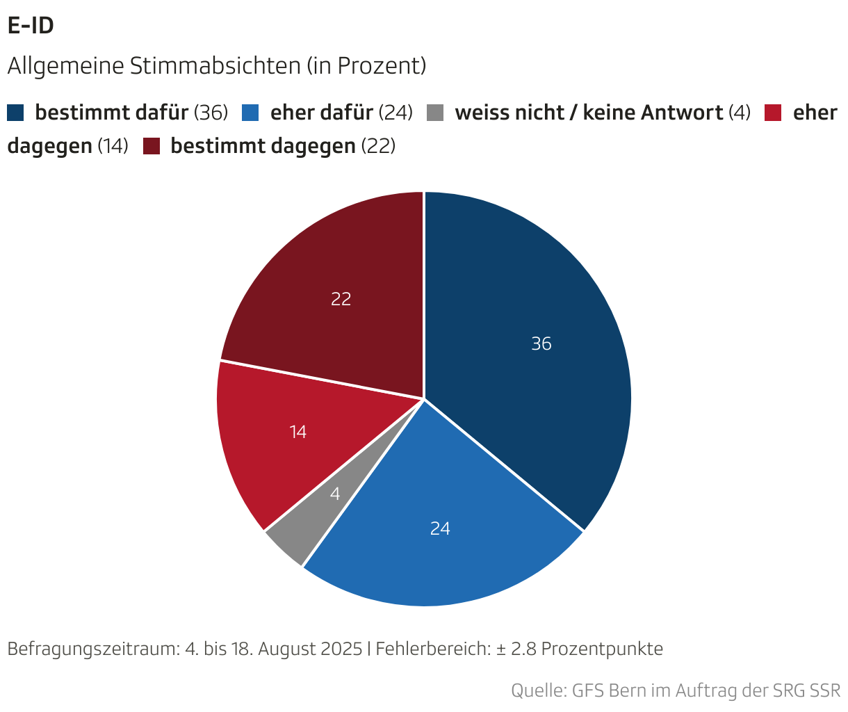 - Wäre bereits Anfang August abgestimmt worden, hätten sich 60 Prozent der befragten Stimmberechtigten für die E-ID ausgesprochen, so die 1. SRG-Umfrage zur Abstimmung vom 28. September 2025.