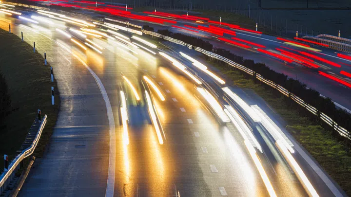 Autobahn in der Dunkelheit mit sehr vielen Autos.