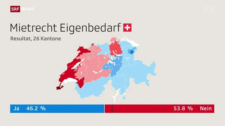 - Nach langer Unklarheit zeigt das Schlussresultat: Beide Vorlagen wurden vom Volk abgelehnt. Die Vorlage zur Untermiete wurde mit 51.6 Prozent abgelehnt, jene zum Eigenbedarf mit 53.8 Prozent.