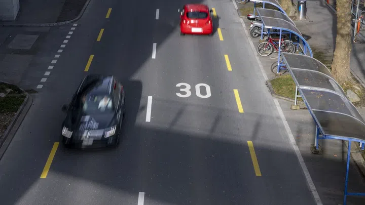 Legende: Die Initiative «Tempo 30 – nur mit Zustimmung des Volkes» wurde vom TCS lanciert und hat das Ziel, dass Entscheide für Tempo 30 demokratisch besser abgestützt sind. Keystone/Jean-Christophe Bott
