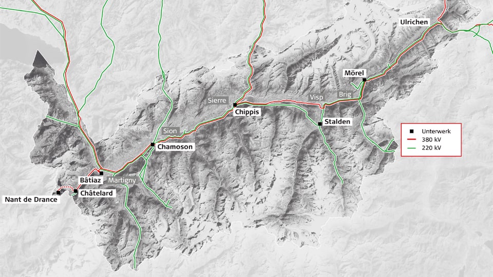 Einige der wichtigsten dieser Stromleitungen sollen durchs Wallis führen. Der Widerstand dagegen ist jedoch erbittert. Bauen kann die Swissgrid deshalb bisher bloss im Goms – dort entsteht gerade eine Höchstspannungsleitung mit bis zu 380 Kilovolt Spannung.