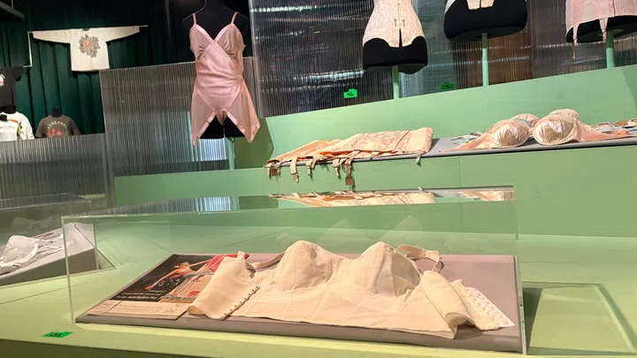 Bild 1 von 3. Die Farben der BHs und Korsetts in der Ausstellung sind vor allem Hauttöne, schwarz und weiss. Bildquelle: SRF / Michael Ulmann.