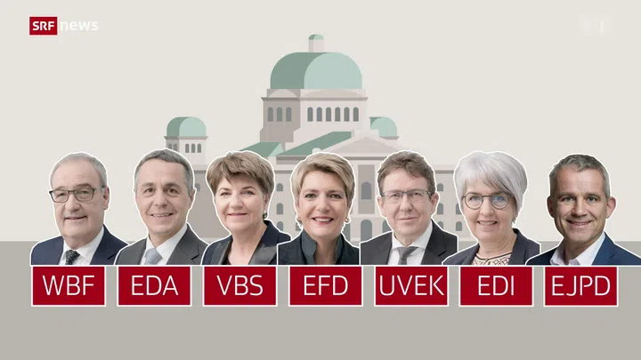 Guy Parmelin bleibt Wirtschaftsminister, Ignazio Cassis steht weiterhin dem Aussendepartement vor, Viola Amherd behält das Verteidigungsdepartement, Karin Keller-Sutter ist auch künftig Finanzvorsteherin, und Albert Rösti bleibt Umwelt- und Energieminister.