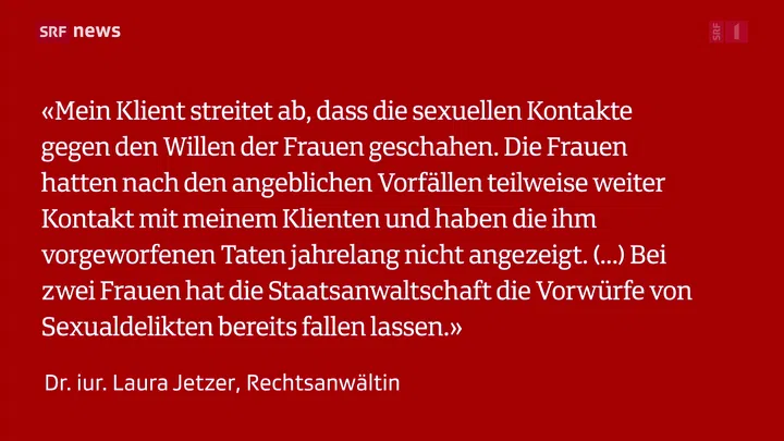 Die Verteidigerin des Angeklagten hat sich gegenüber SRF schriftlich zu den Vorwürfen geäussert: «Mein Klient streitet ab, dass die sexuellen Kontakte gegen den Willen der Frauen geschahen. Die Frauen hatten nach den angeblichen Vorfällen teilweise weiter Kontakt mit meinem Klienten und haben die ihm vorgeworfenen Taten jahrelang nicht angezeigt. (...) Bei zwei Frauen hat die Staatsanwaltschaft die Vorwürfe von Sexualdelikten bereits fallen lassen.»