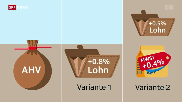 - Um die zusätzlichen 4.2 Milliarden Franken zu finanzieren, sollen entweder nur die Lohnbeiträge um 0.8 Prozentpunkte erhöht werden. Oder aber in Kombination mit 0.5 Prozentpunkten mehr Lohnbeitrag und 0.4 Prozentpunkten mehr Mehrwertsteuer.