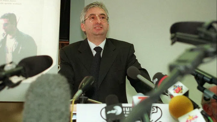 Bild 3 von 3. Der damalige Zürcher Bezirksanwalt Rolf Jäger informierte am Montag, 8. September 1997, in Zürich über die Fahndungserfolge der Behörden in Sachen Postraub in der Fraumünster-Post. Bildquelle: Keystone/Christoph Ruckstuh.