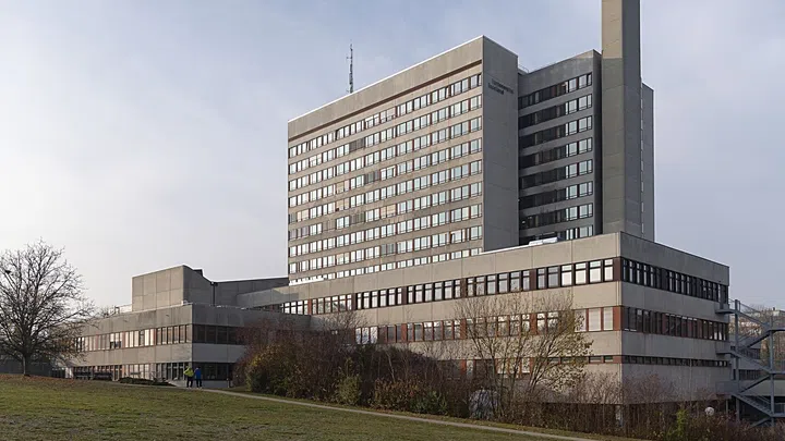 Grosses modernes Gebäude mit mehreren Stockwerken und Antennen auf dem Dach.