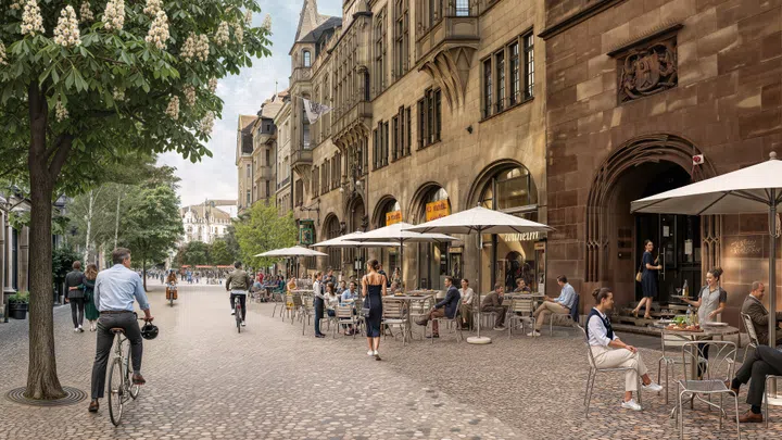 Visualisierung der Falknerstrasse: Menschen sitzen in Cafés oder spazieren.
